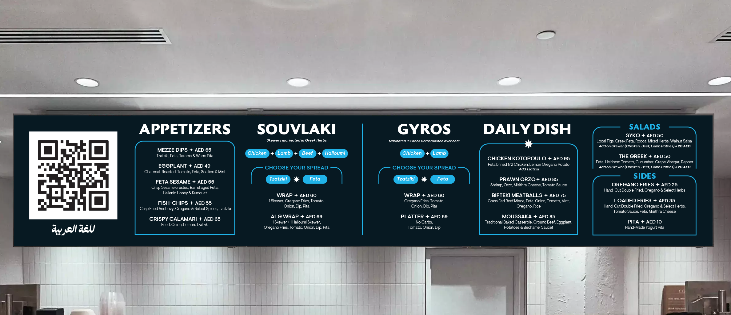 À La Grecque is a Greek restaurant located inside the Time Out Market in Dubai. The brief was to create a fun and lively brand, emulating the spirit of a small suvlaki shop in Greece.